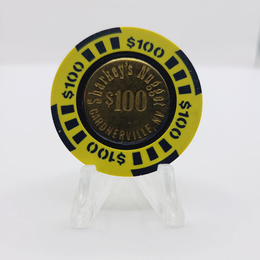 Sharky's Nugget Casino Gardnerville Nevada 1988 $100 Brass Coin Center Casino Chip N9064