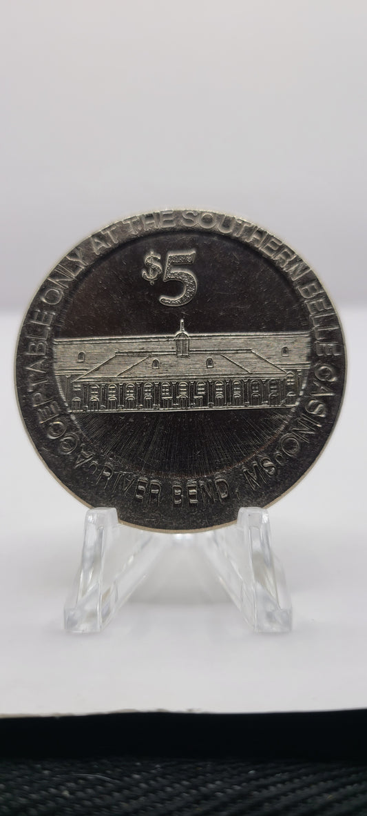 Southern Belle Casino River Bend MS 1994,"Riverboat" Casino $5 Gaming Token (Error center offset)