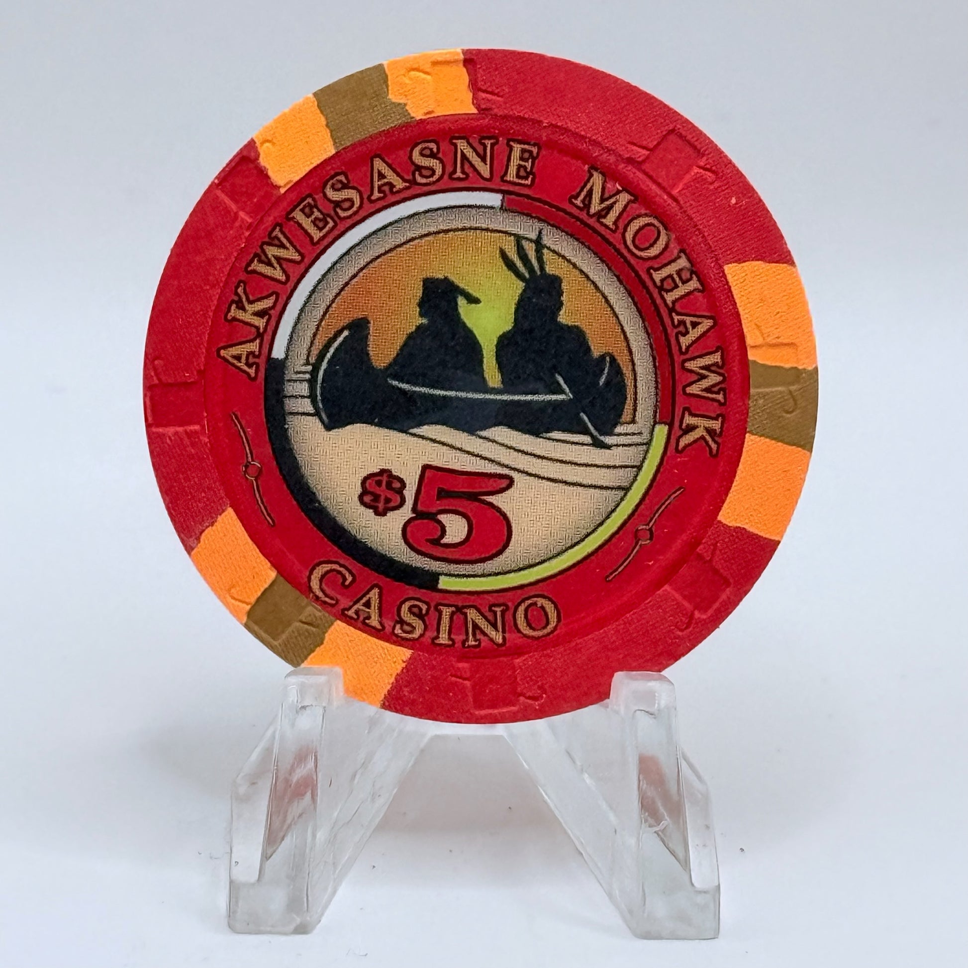 Straight from the tables of the historic Akwesasne Mohawk Casino, this 1999 $5 chip is a vintage relic of Hogansburg nightlife dating back to 1999.
