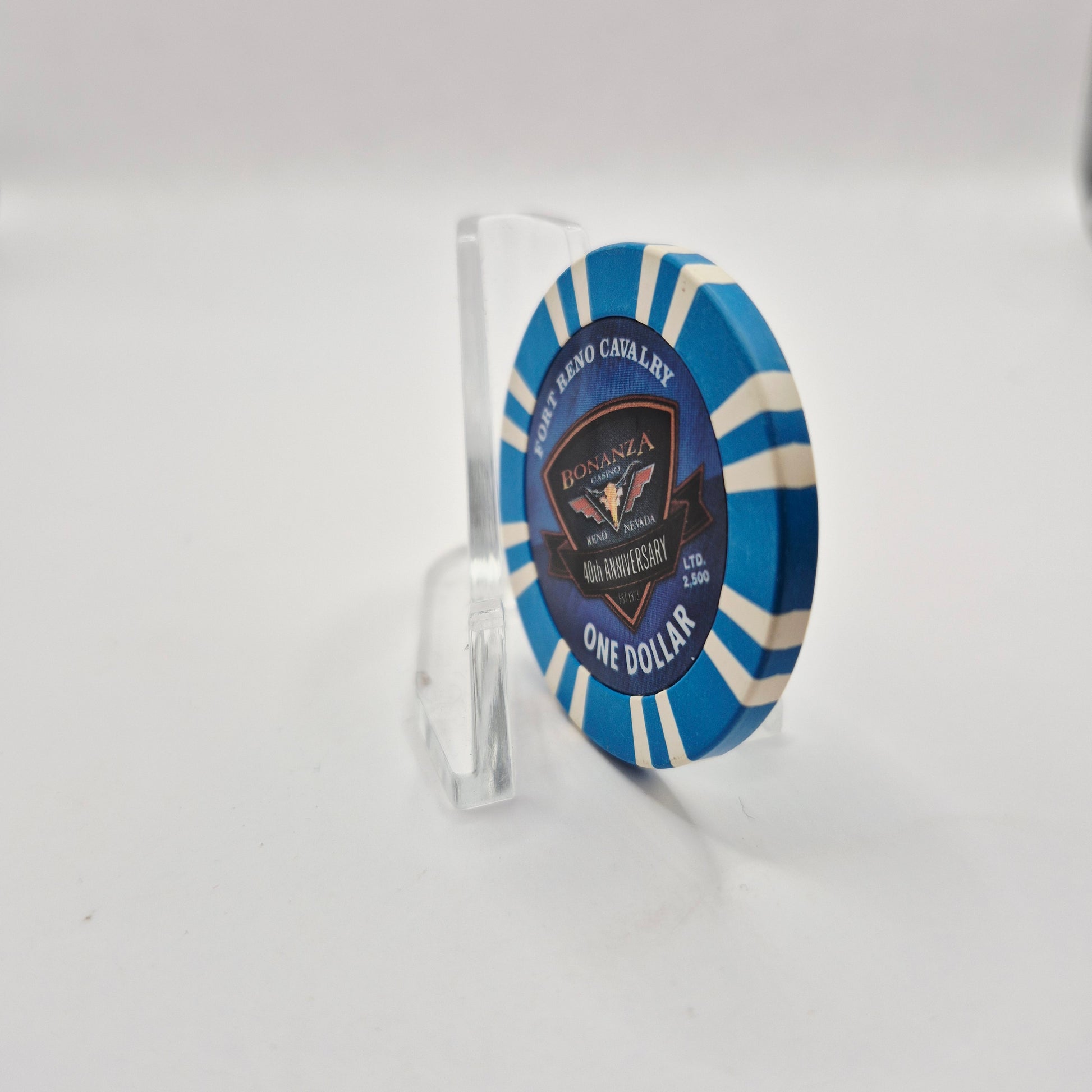 Experience a piece of history with the Bonanza Casino 2012 'Hot August Nights' $1 Casino Chip. This rare collectible features a design from the vintage 1962 Chevy Impala SS and commemorates the opening of the casino in 1979. Add this limited edition chip to your collection today.