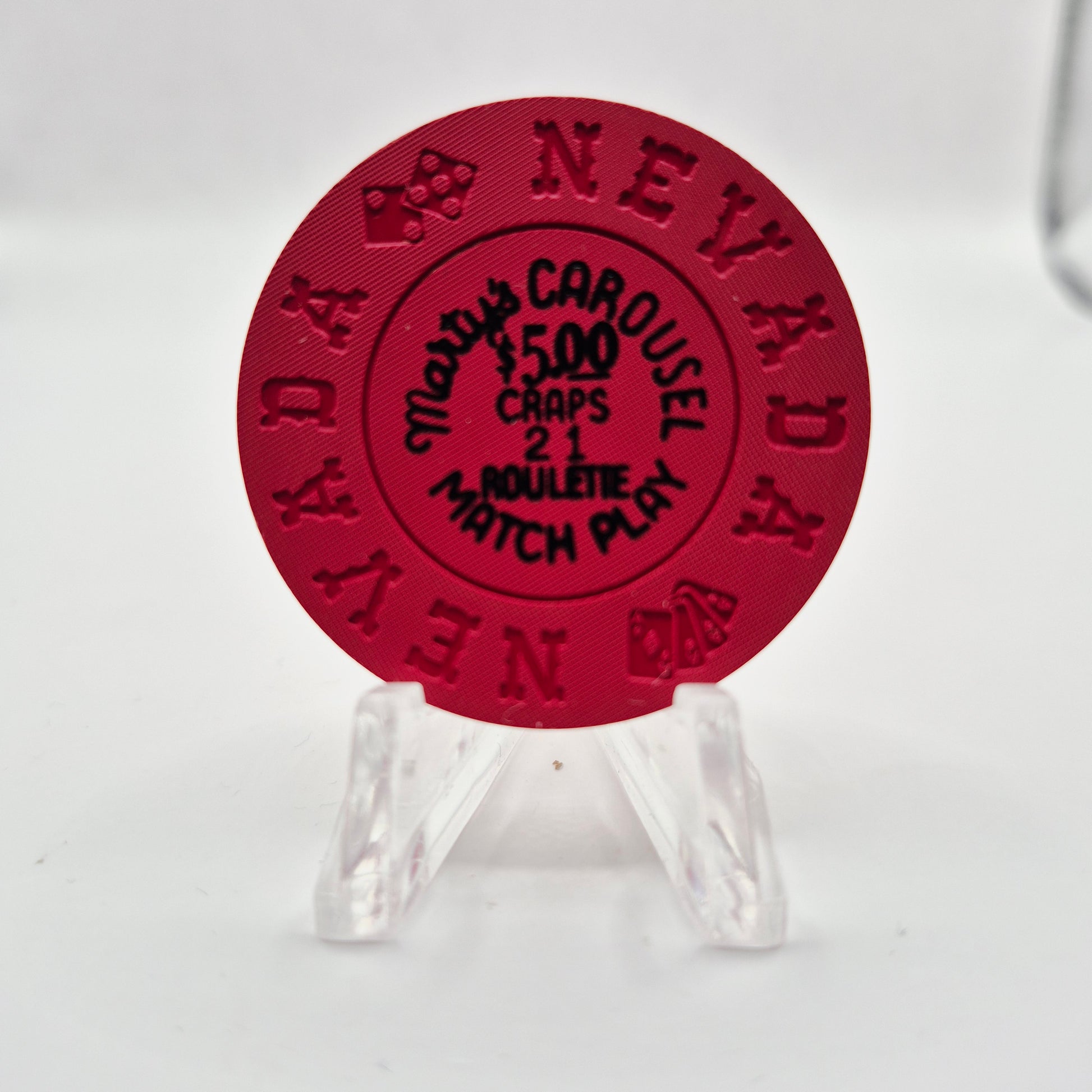 This collectible casino chip from Carousel 'Marty's' Casino in Las Vegas is a limited edition piece of casino history. Open from 1965 to 1974, this chip showcases the classic games of craps, blackjack, roulette, and match play, making it a must-have for any casino aficionado.