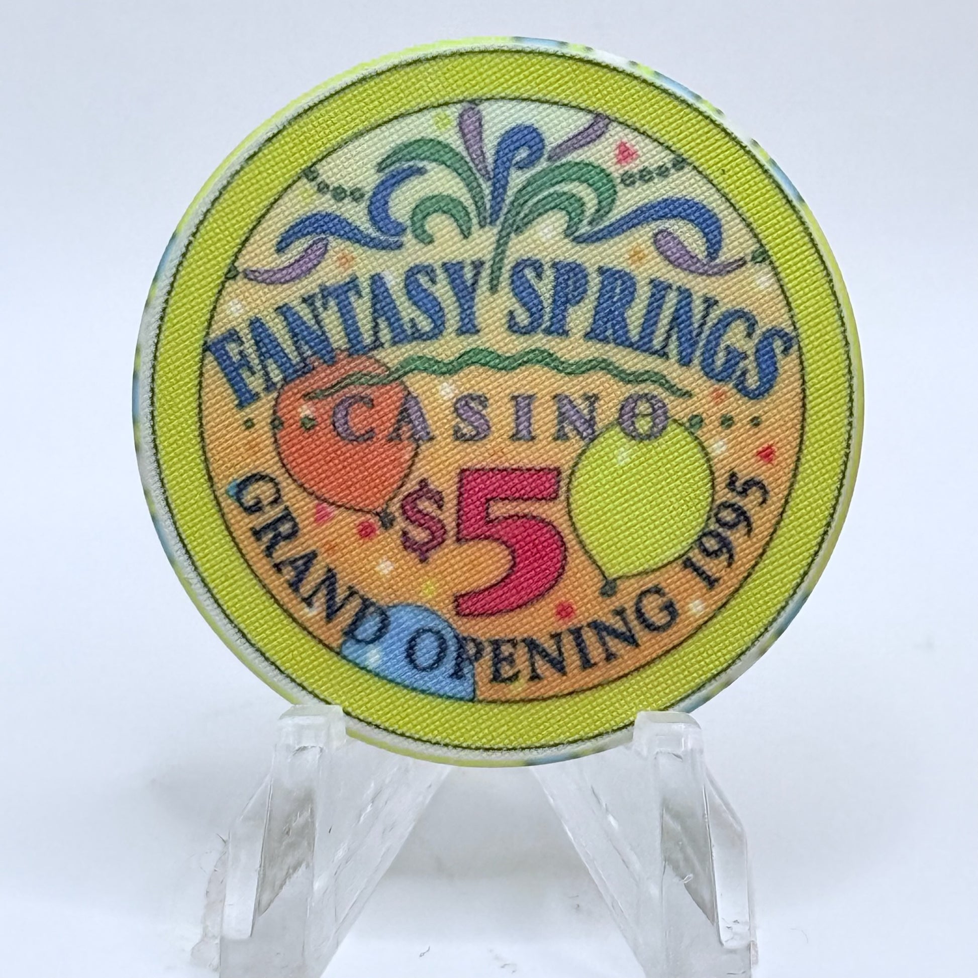 Step back to 1995 in Indio, when the doors of Fantasy Springs Casino first opened, this 1995 $5 chip carries that same opening-day excitement.