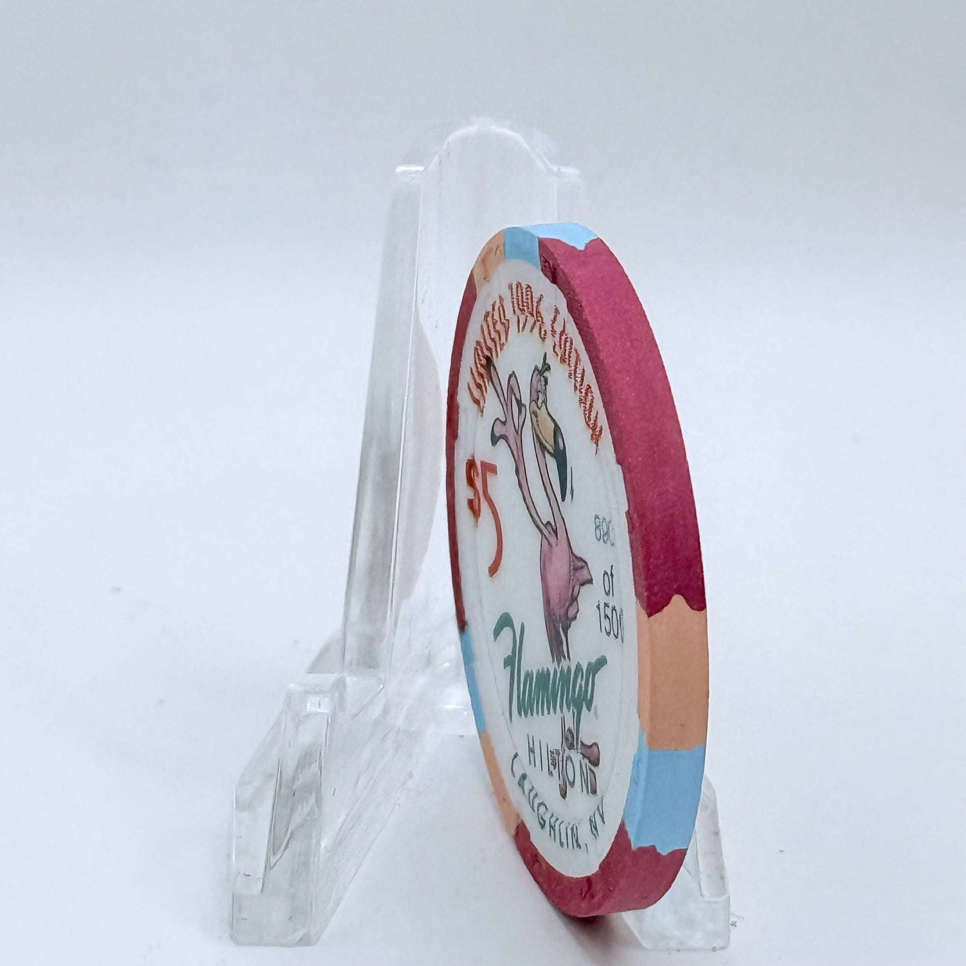 This 1996 $5 chip from Flamingo Hilton captures the spirit of Laughlin, Nevada during its golden age between 1990 and 2000.