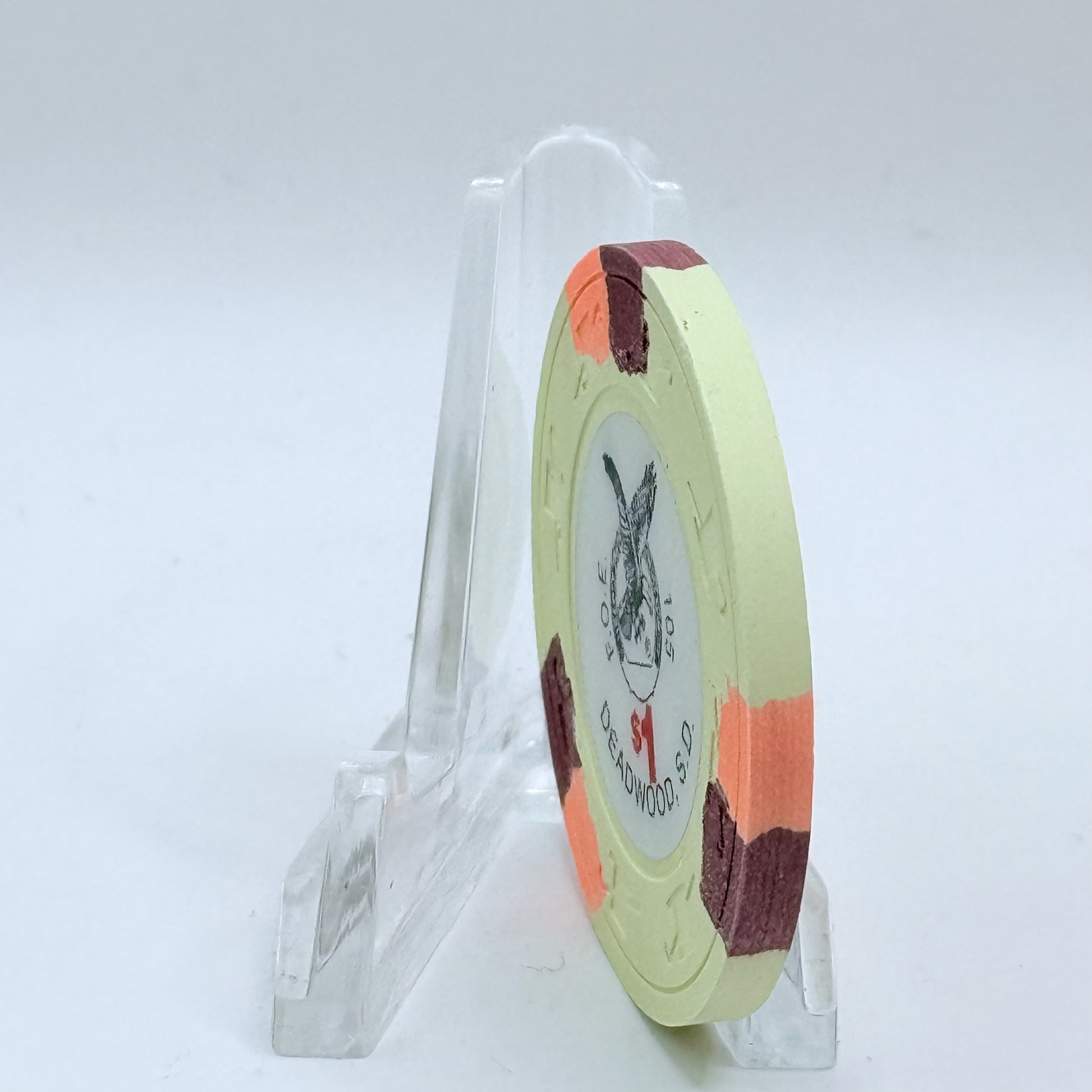This 1990 $1 chip from F.O.E. 105 captures the spirit of Deadwood, South Dakota during its golden age between 1990 and 1991.