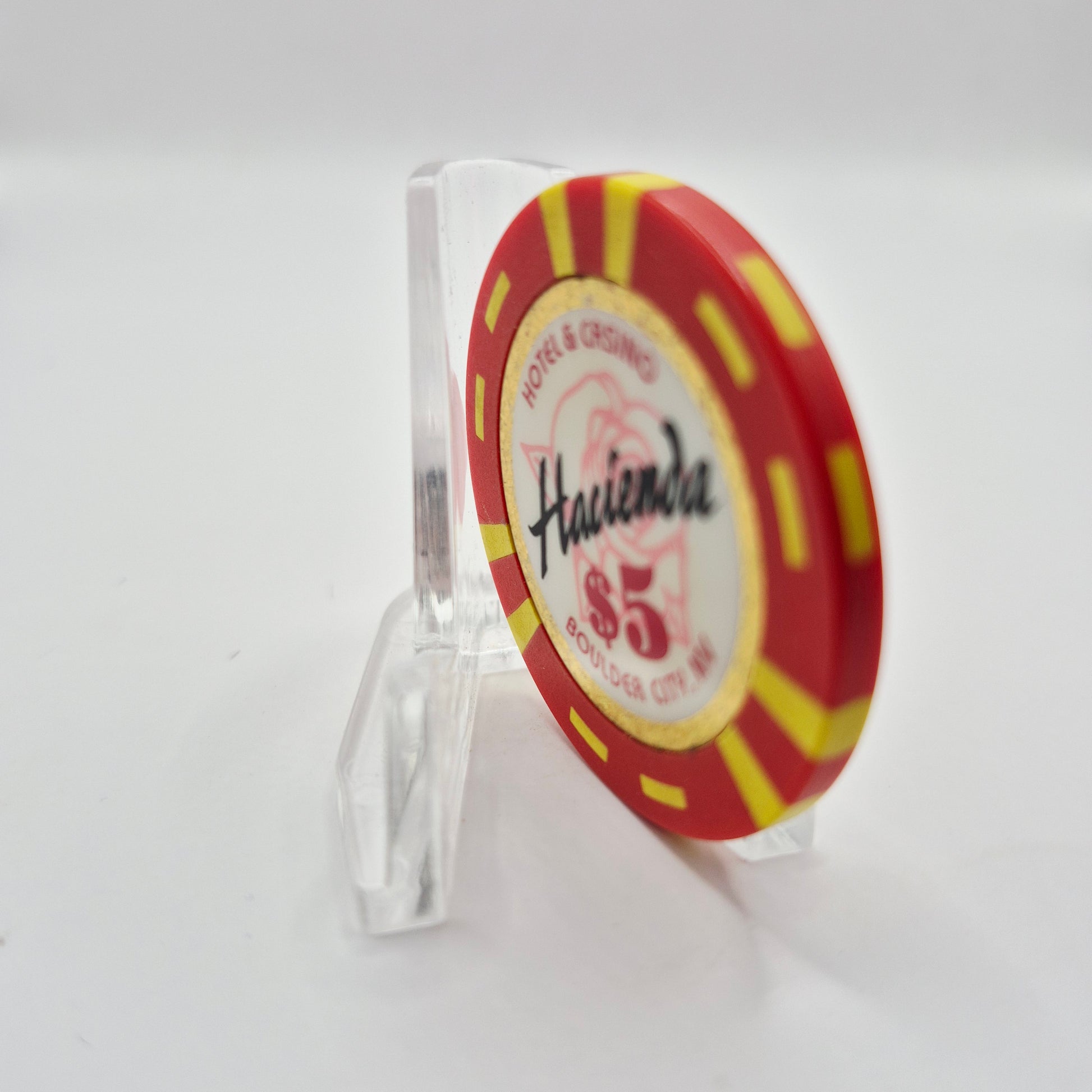 Experience a piece of history with the Hacienda Hotel Casino Boulder City Nevada $5 chip from 1999-2013. This rare chip represents the 14 years of excitement and entertainment the Hacienda offered before closing its doors. Add it to your collection today.