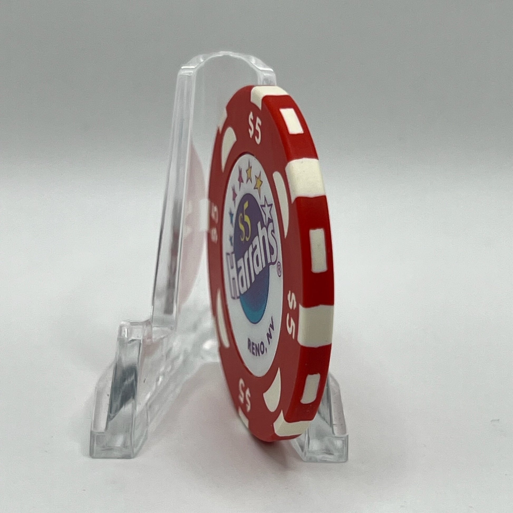 Experience the legacy of Harrah's Reno with this 2004 $5 casino chip E4553! Relive the excitement of the doors opening in 1946 and cherish this piece of history as the casino closed its doors in 2020. Don't miss your chance to own a piece of history with this collectible casino chip.