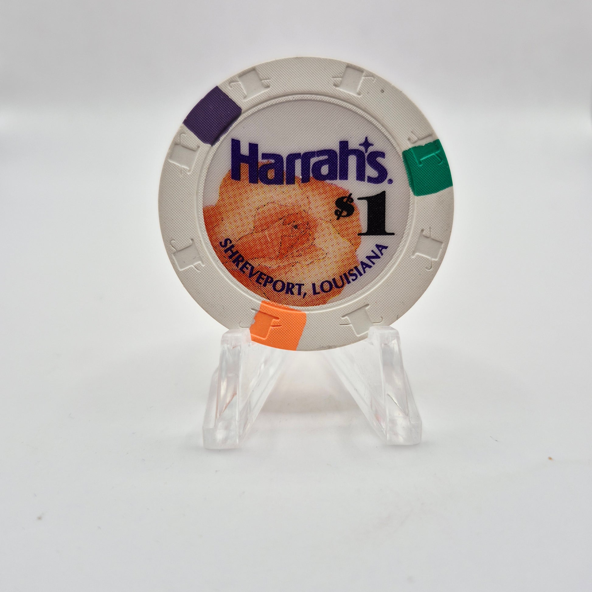 Explore the history of Harrah's Casino Shreveport Louisiana with this $1 casino chip from their opening in 1994 until they closed their doors in 2004. Collect and display this piece of casino nostalgia and relive the excitement of a bygone era.