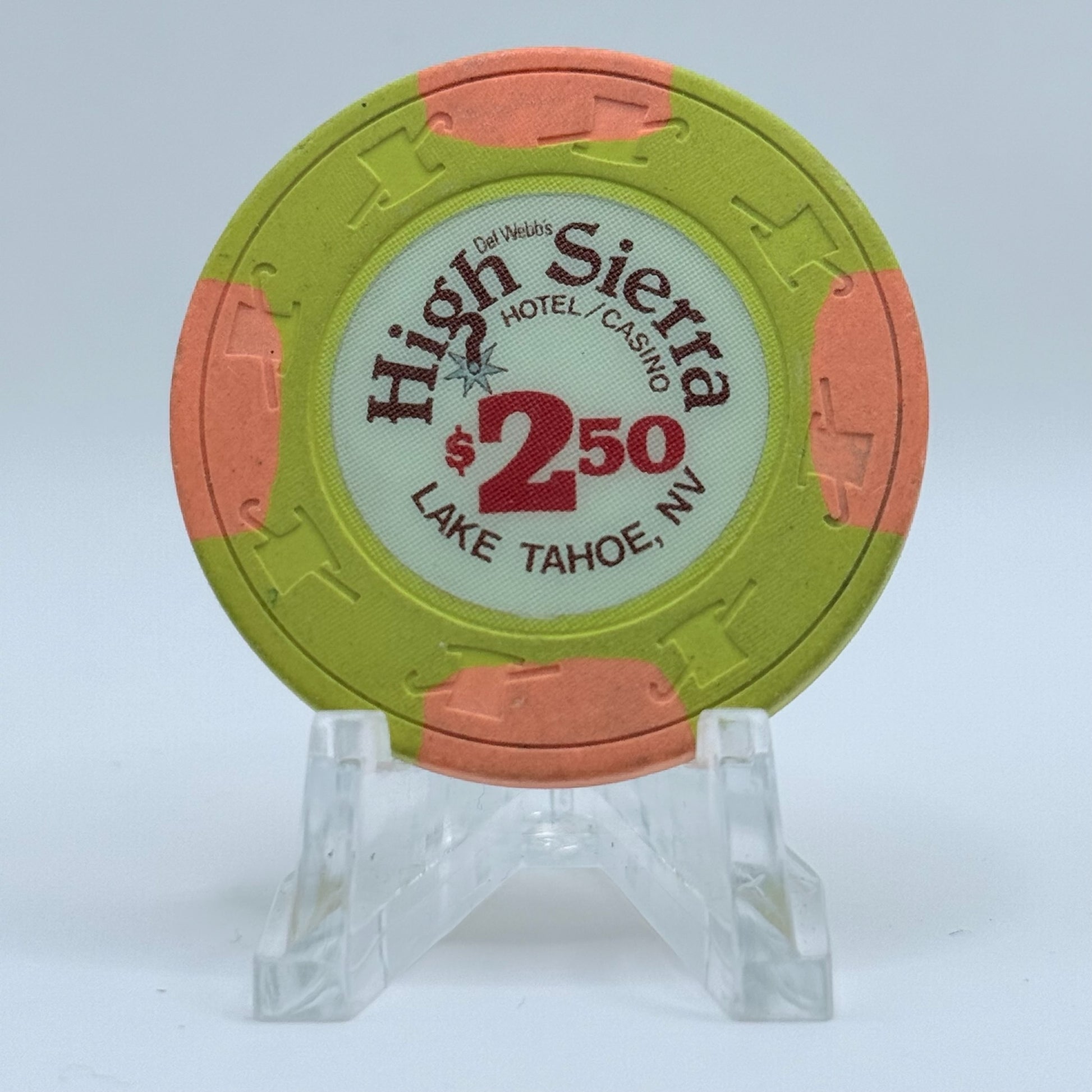 Own a piece of Las Vegas history with this genuine $2.50 chip from the legendary High Sierra casino. This chip, from the open years of 1983 to 1990, is a collector's item for any casino enthusiast. Don't miss out on owning a part of the iconic Lake Tahoe Nevada!