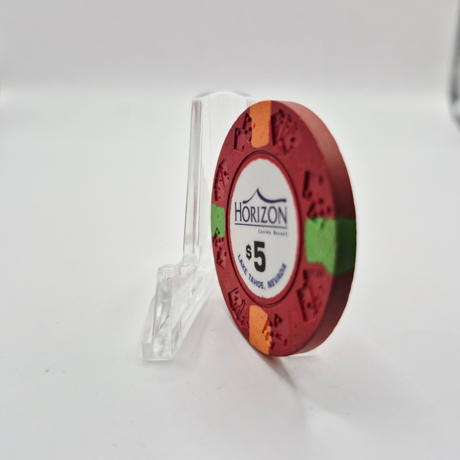 This $5 casino chip from Horizon Casino Lake Tahoe Nevada was used during the casino's operation from 1990 to 2014. Add it to your collection as a piece of casino history.
