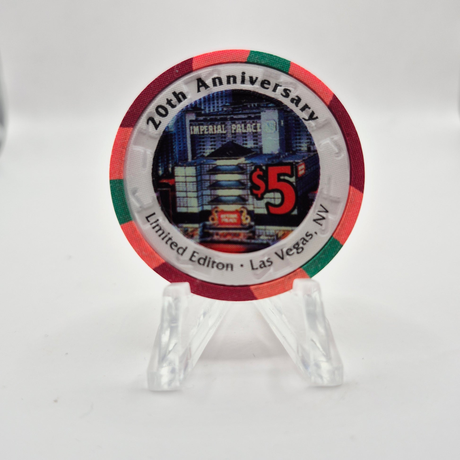 This collectible $5 casino chip commemorates the 20th anniversary of the Imperial Palace Casino in Las Vegas, open from 1979 to 2012. A perfect addition to any collection for casino enthusiasts and fans of Las Vegas history.