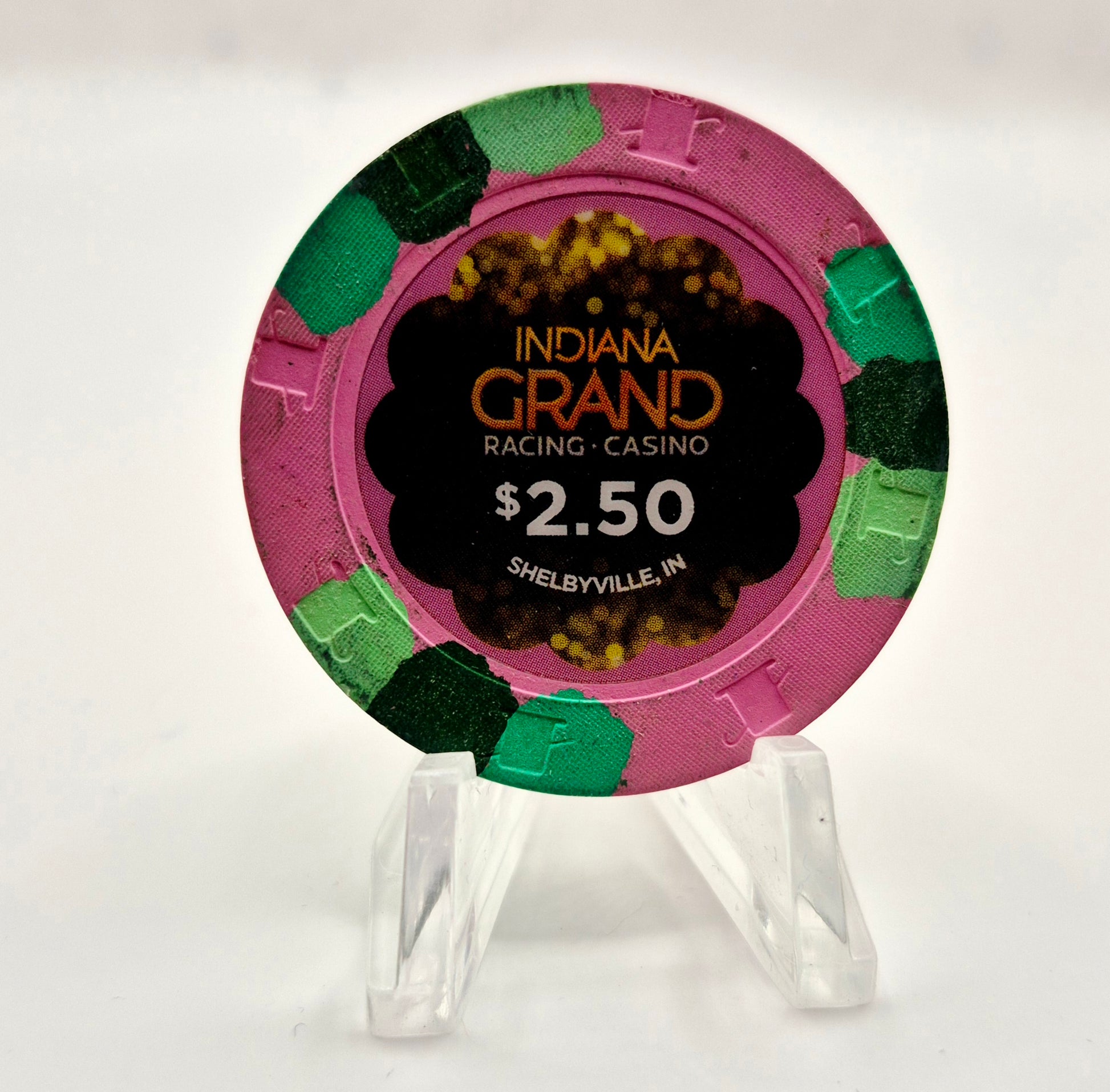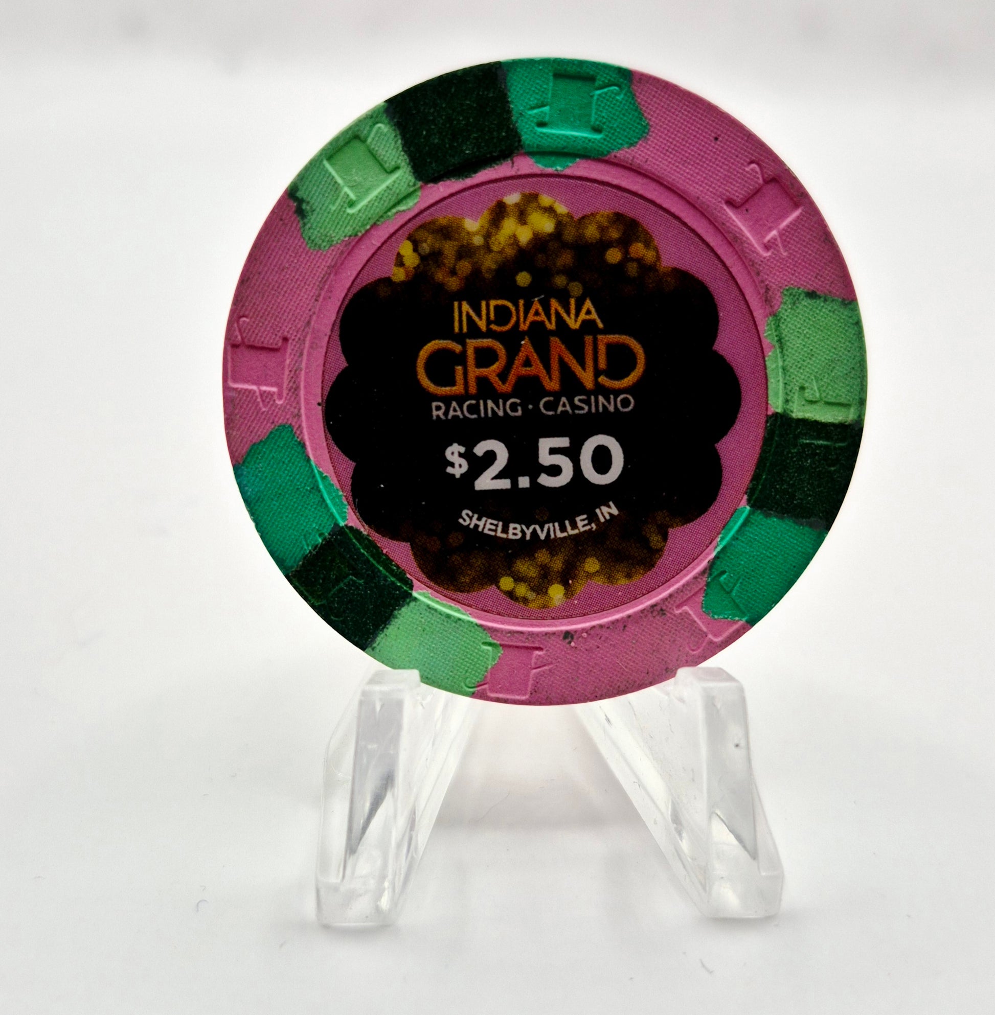 The Indiana Grand Hotel Casino $2.50 chip represents a significant collectible from a casino operational from 2013 until 2021. Its limited availability reflects the venue's historical importance in the gaming industry. Collectors may find value in its representation of a now-closed establishment, enhancing its appeal in the market.