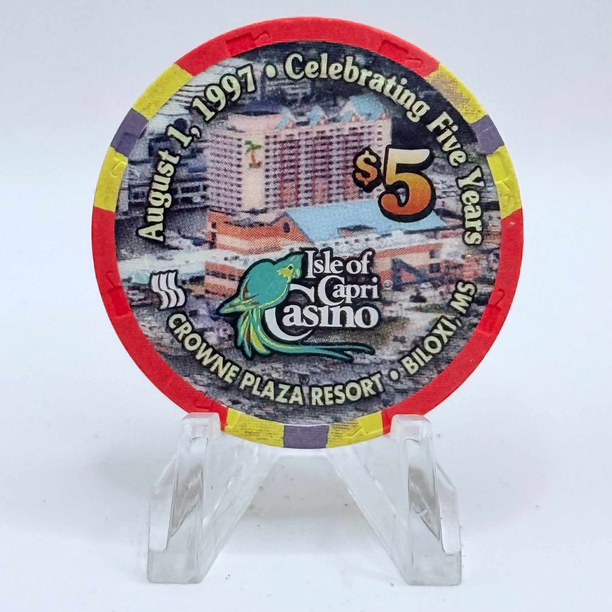 Add a touch of classic Biloxi flair to your collection with this 1997 $5 chip from the historic Isle of Capri (Riverboat), open from 1992 to 2005.