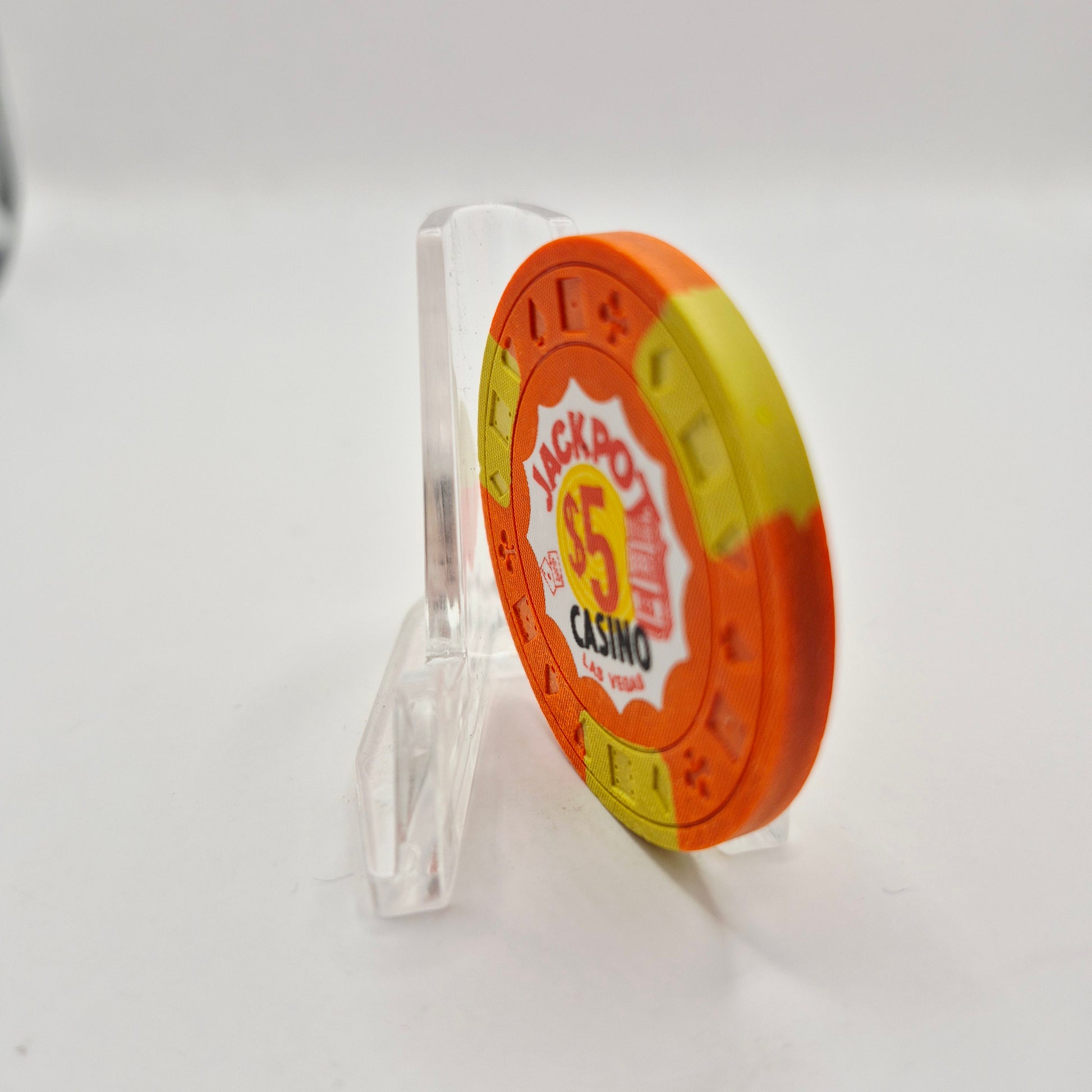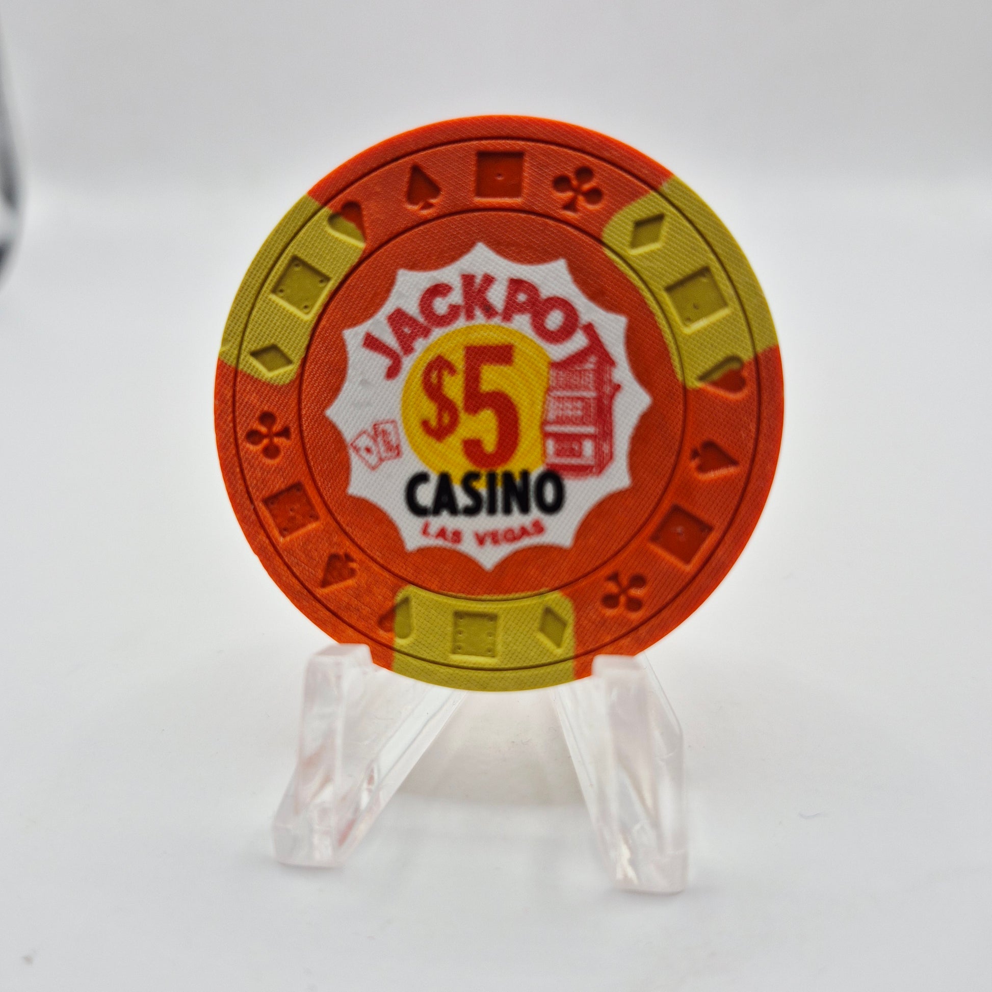 This collectible casino chip is a piece of history from Jackpot Casino in Las Vegas, operating from 1971 to 1977. Add this unique $5 chip to your collection and own a piece of vintage Vegas.