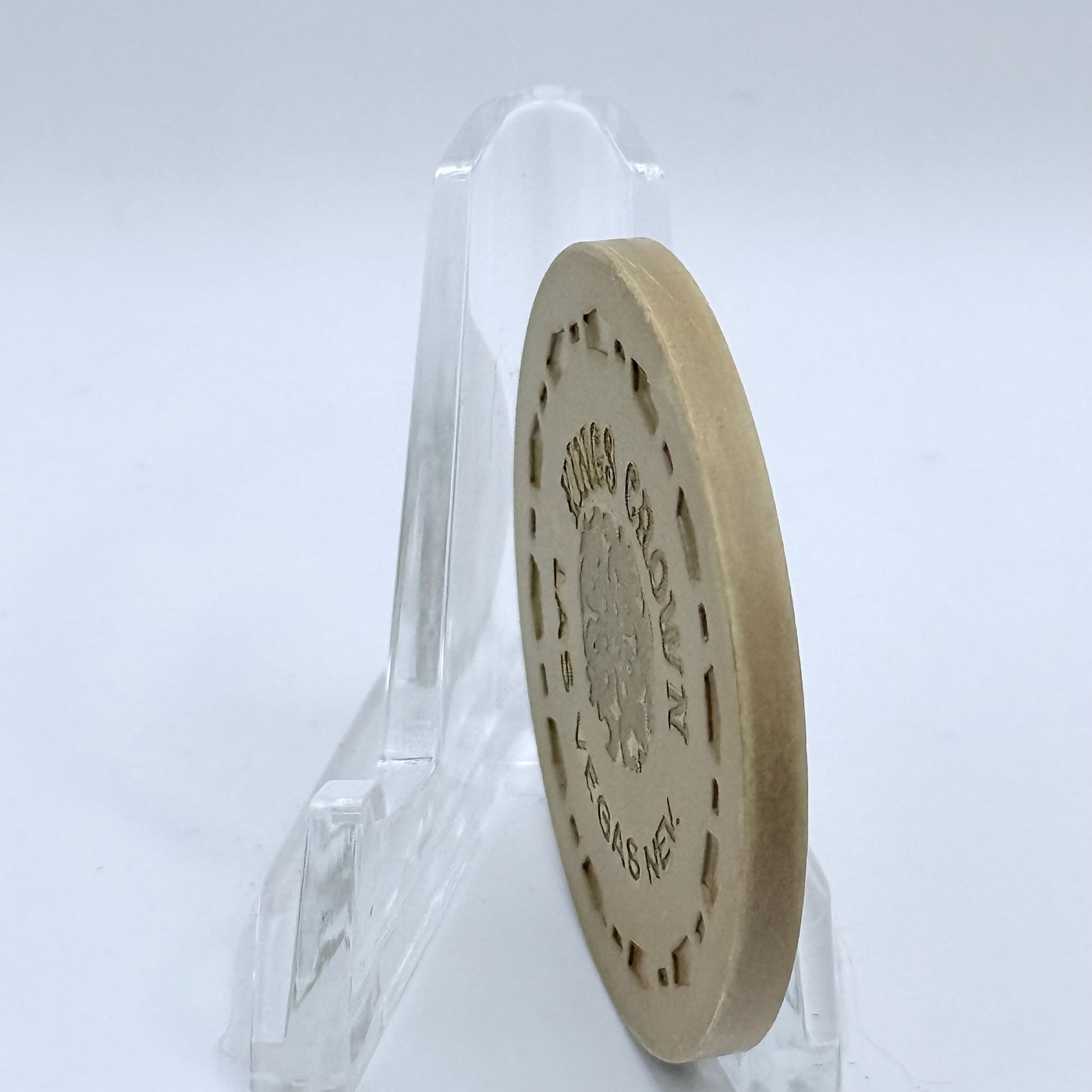 Whether you're a collector or a fan of casino history, this 1966 $5 chip from Kings Crown is a true conversation piece. This live gaming casino never opened, just the Tallyho Hotel, later the Aladdin casino was added.