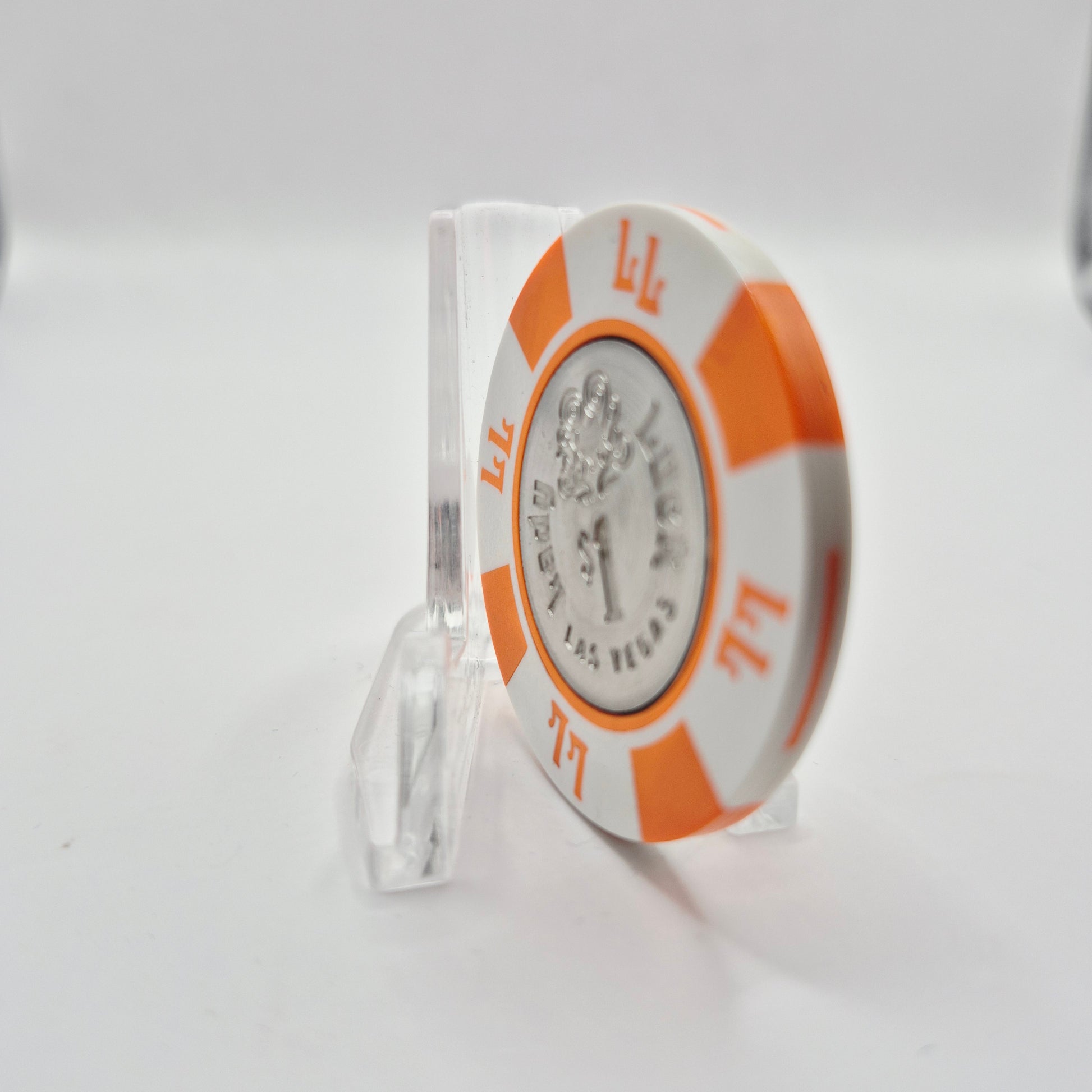 Experience the nostalgia of the 1980s at the Lady Luck Hotel Casino in Las Vegas, Nevada! This "Coin Inlay" $1 chip, featuring the iconic Lady Luck logo, was used during the casino's prime years and captures the essence of the era. With the casino's closure in 2006, this chip is a rare and valuable piece of history.