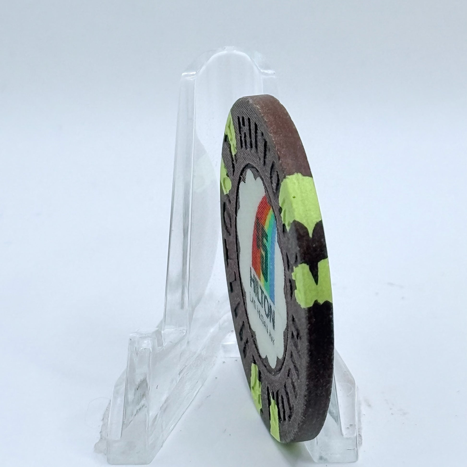 This 1990 $5 chip from Las Vegas Hilton captures the spirit of Las Vegas, Nevada during its golden age between 1971 and 2012.