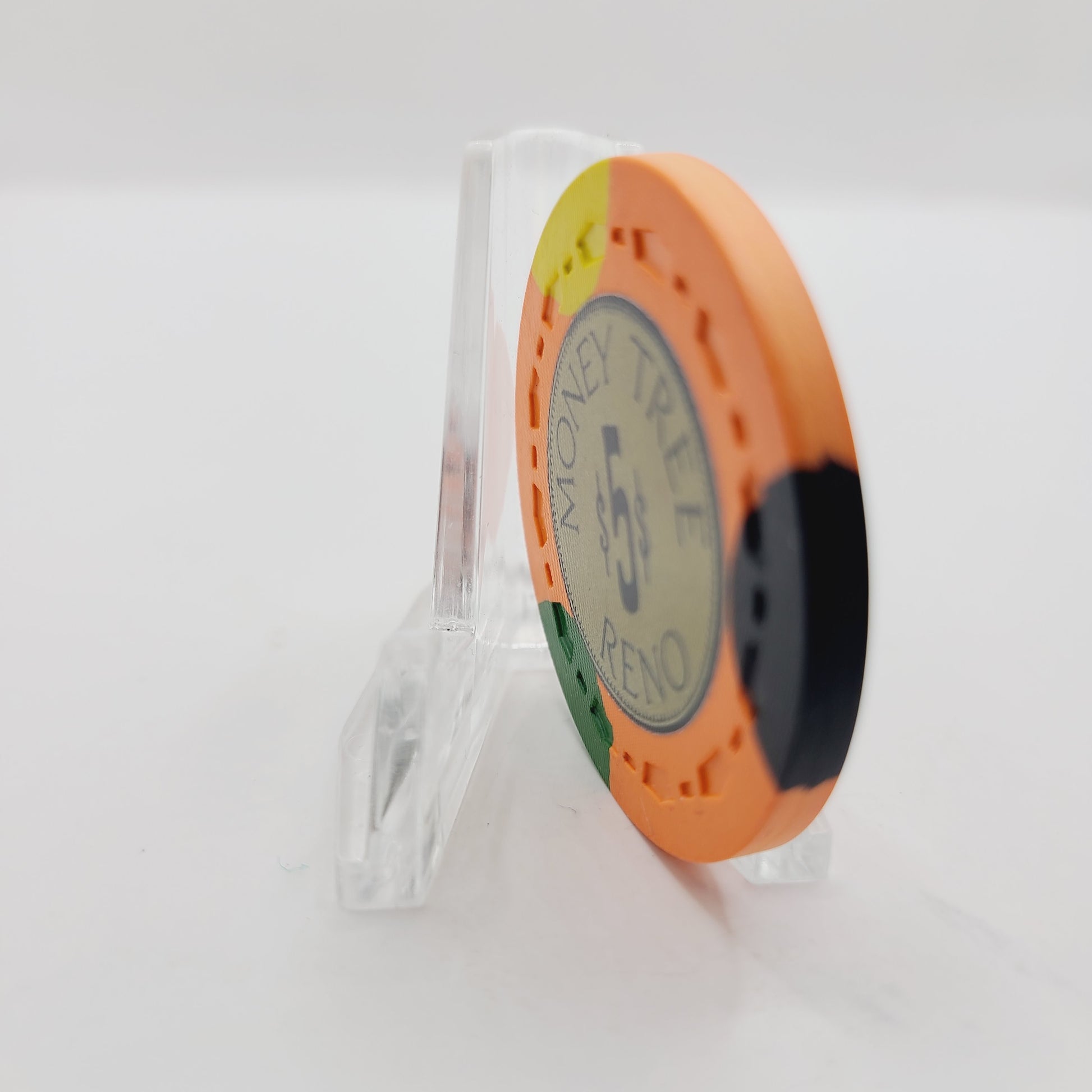 Experience the nostalgia of the 1970's with this vintage Money Tree Casino $5 chip. This rare piece from the now-closed Reno, Nevada casino, which operated from 1969 to 1982, offers a piece of casino history and potential for collectors. Don't miss your chance to own a piece of the past with this one-of-a-kind chip.