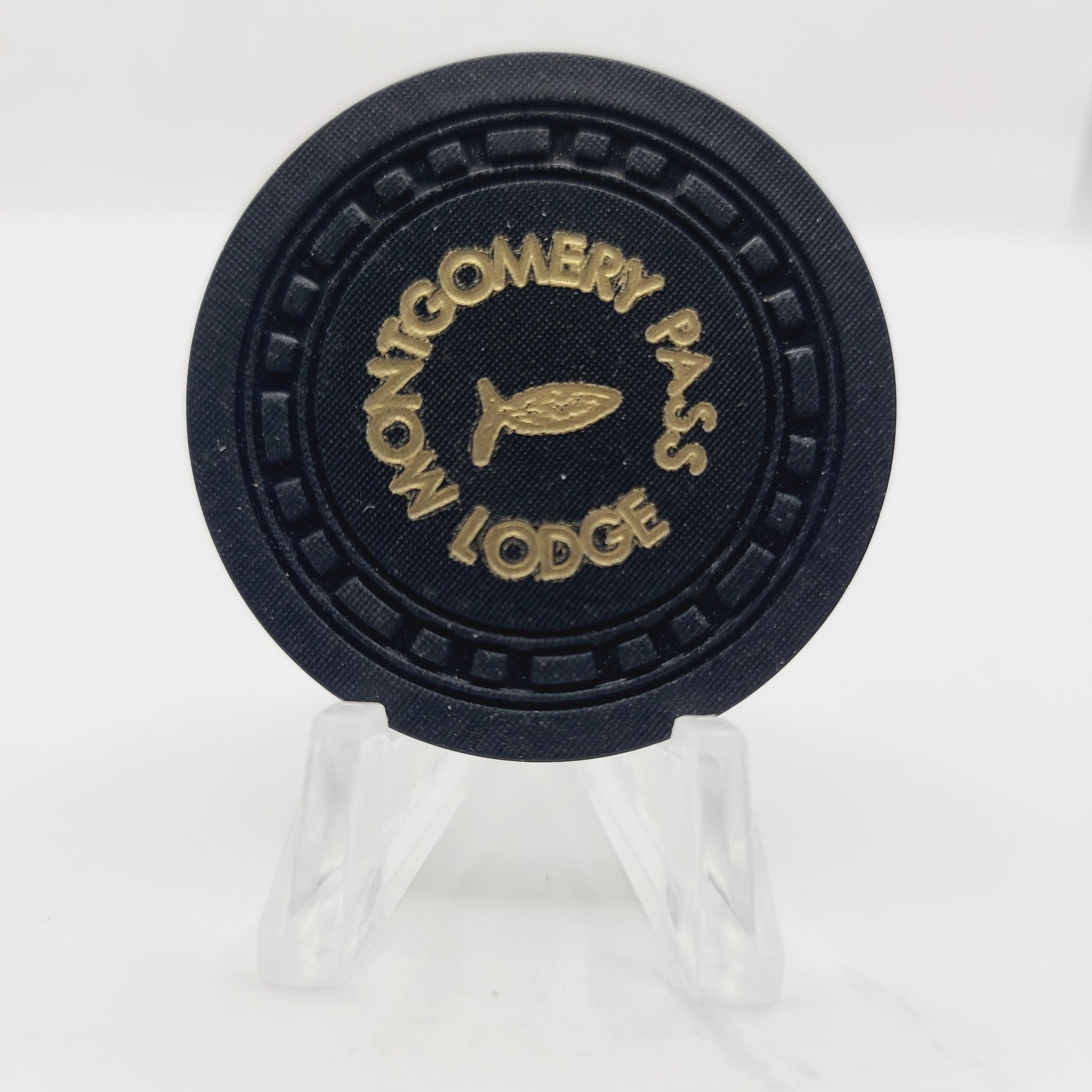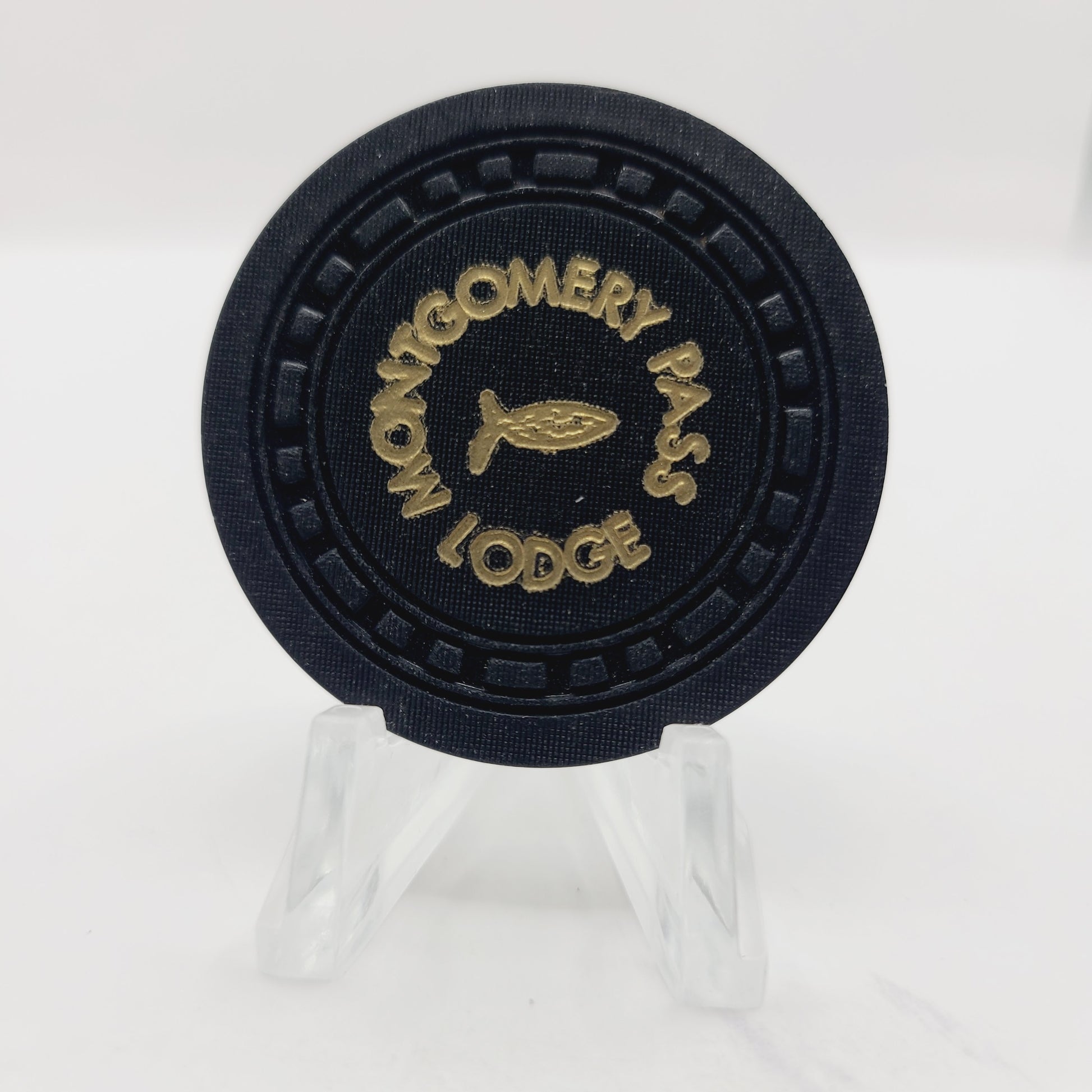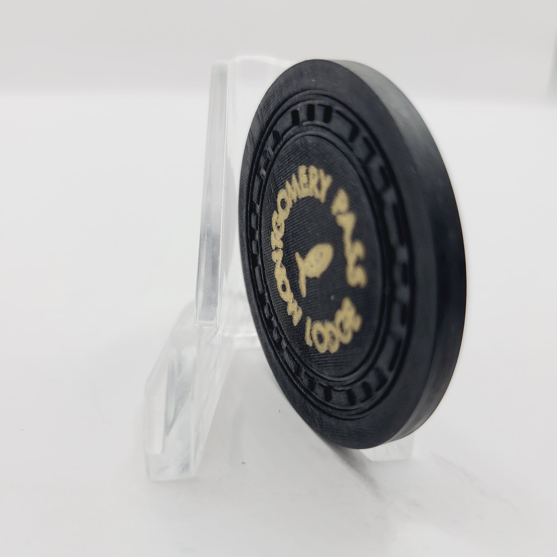 "Expertly crafted in 1953 and retired in 1974, the Montgomery Pass Lodge "Roulette" Chip N3275 (Black) is a vintage piece of casino history. Add it to your collection for a unique glimpse into the past."