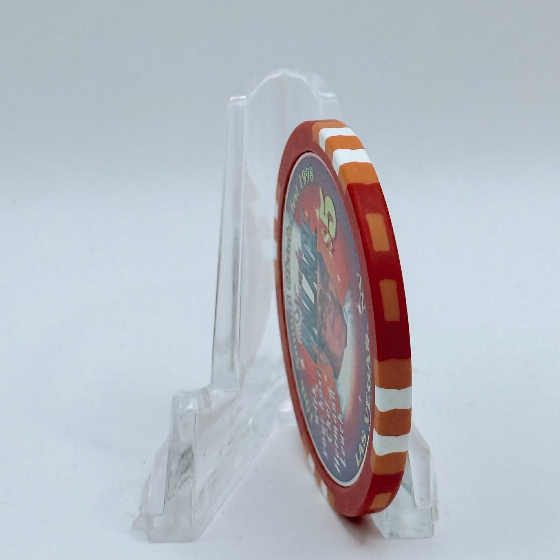 Capture a moment from the vibrant history of Las Vegas with this 1998 $5 chip, once in play at Nevada Palace between 1979 and 2008.