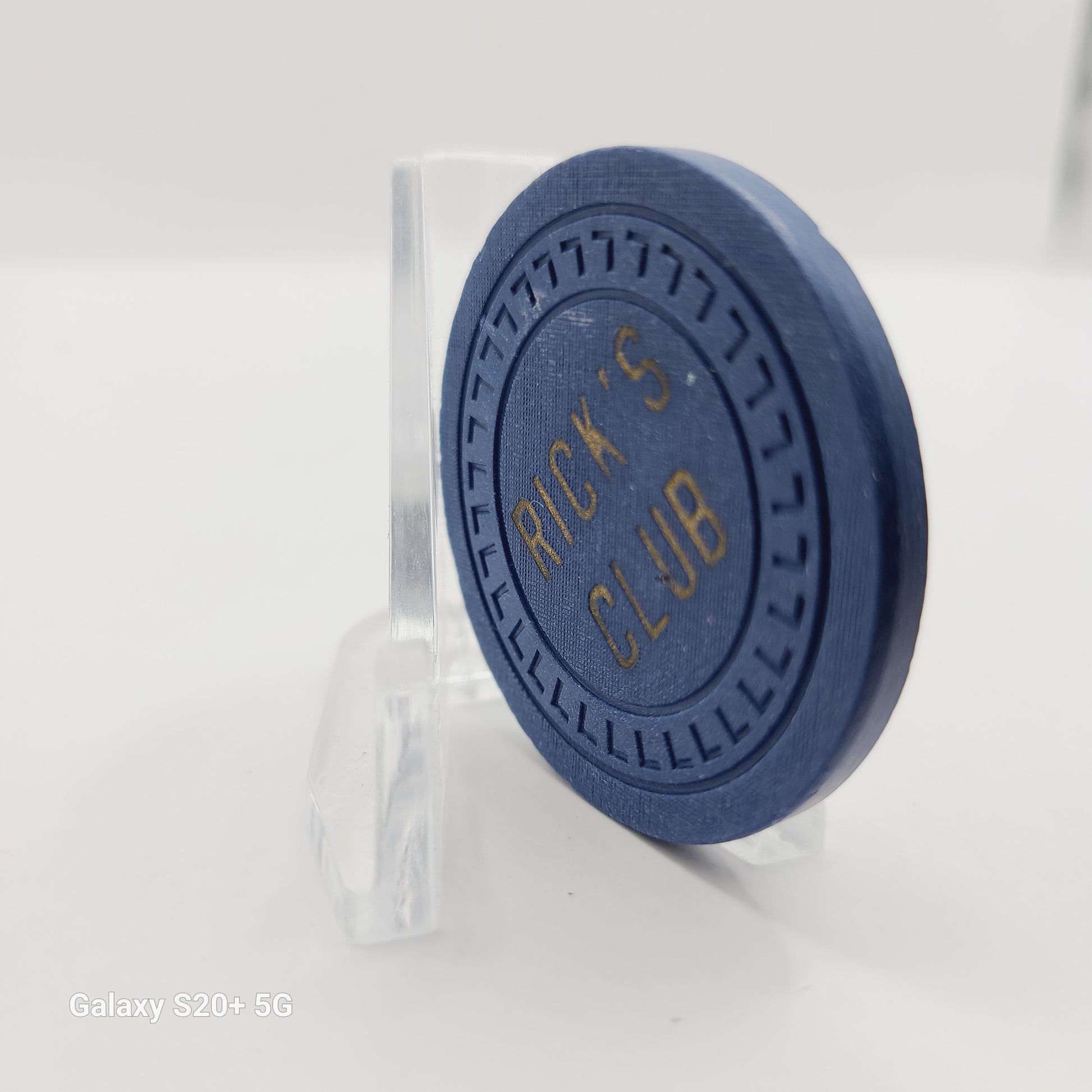 This authentic vintage casino chip, dating from 1954-1960, features the iconic "Rick's Club Card Room" logo. Opened in Pittsburgh, California, this chip serves as a piece of history for any casino chip collector or fan of vintage gambling culture.