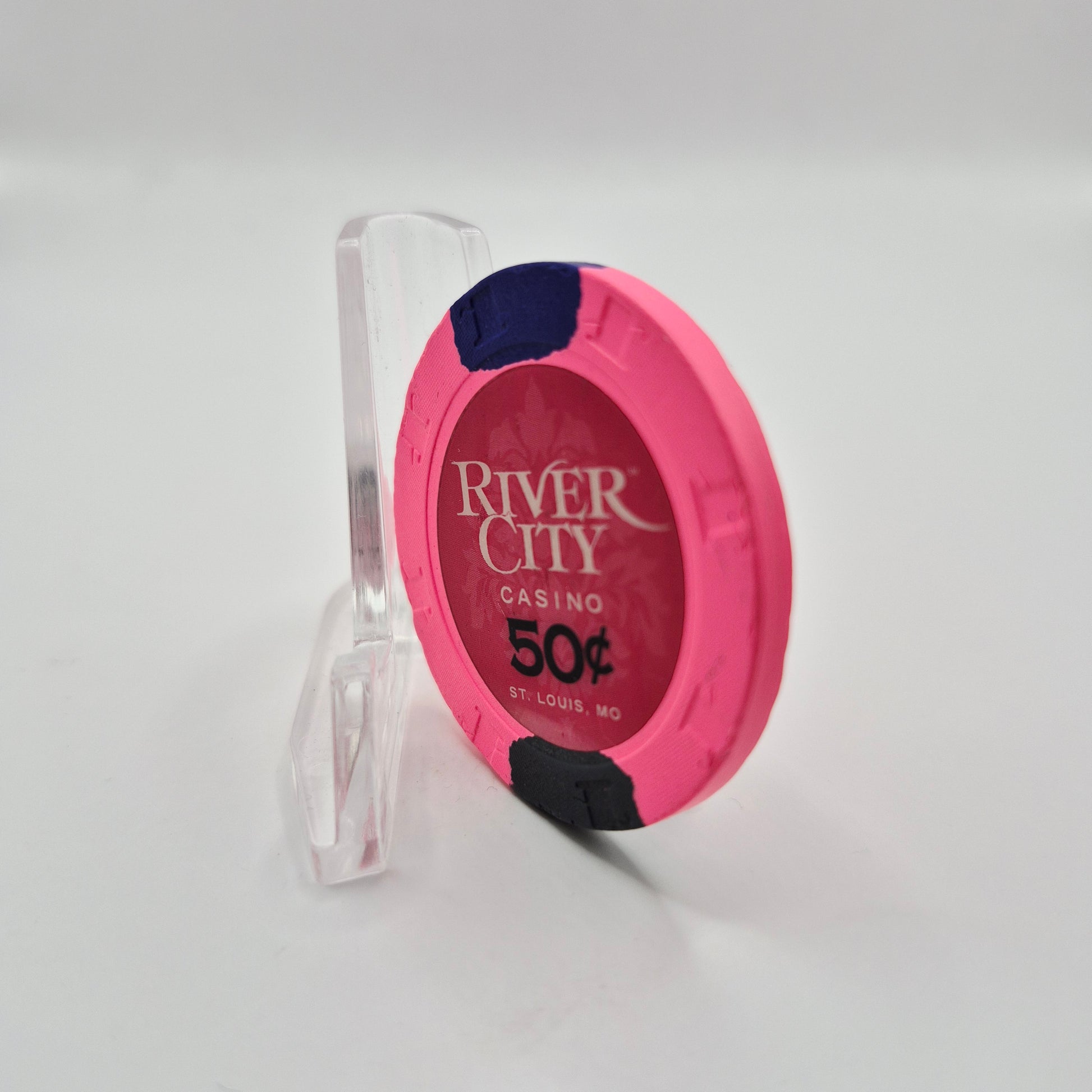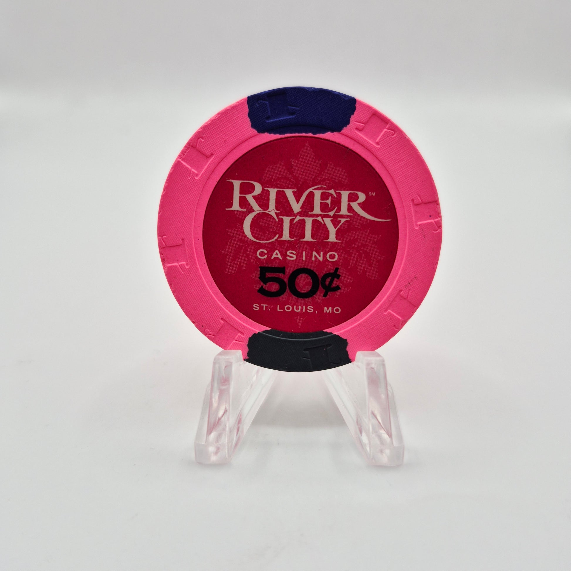 Discover the River City Hotel Casino St. Louis Missouri with this 2010 $.50 casino chip. Featuring a modern and sleek design, this casino opened its doors in 2010, providing guests with top-notch entertainment and gaming experiences. Don't miss your chance to add this limited edition chip to your collection.
