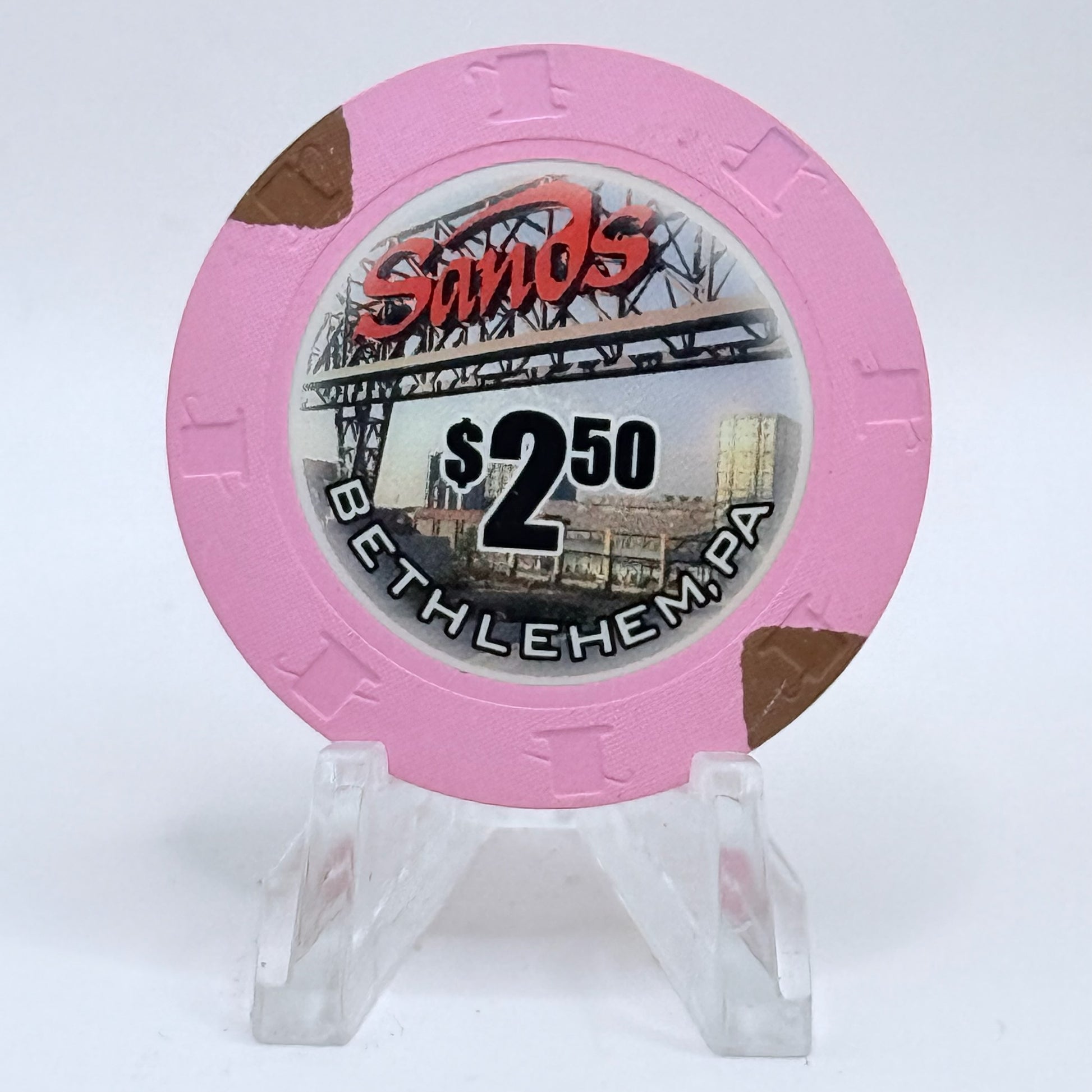 Preserved from the floors of Sands Casino Resort Bethlehem, open from 2009 to 2019, this $2.50 chip embodies a bygone era of Bethlehem gaming.