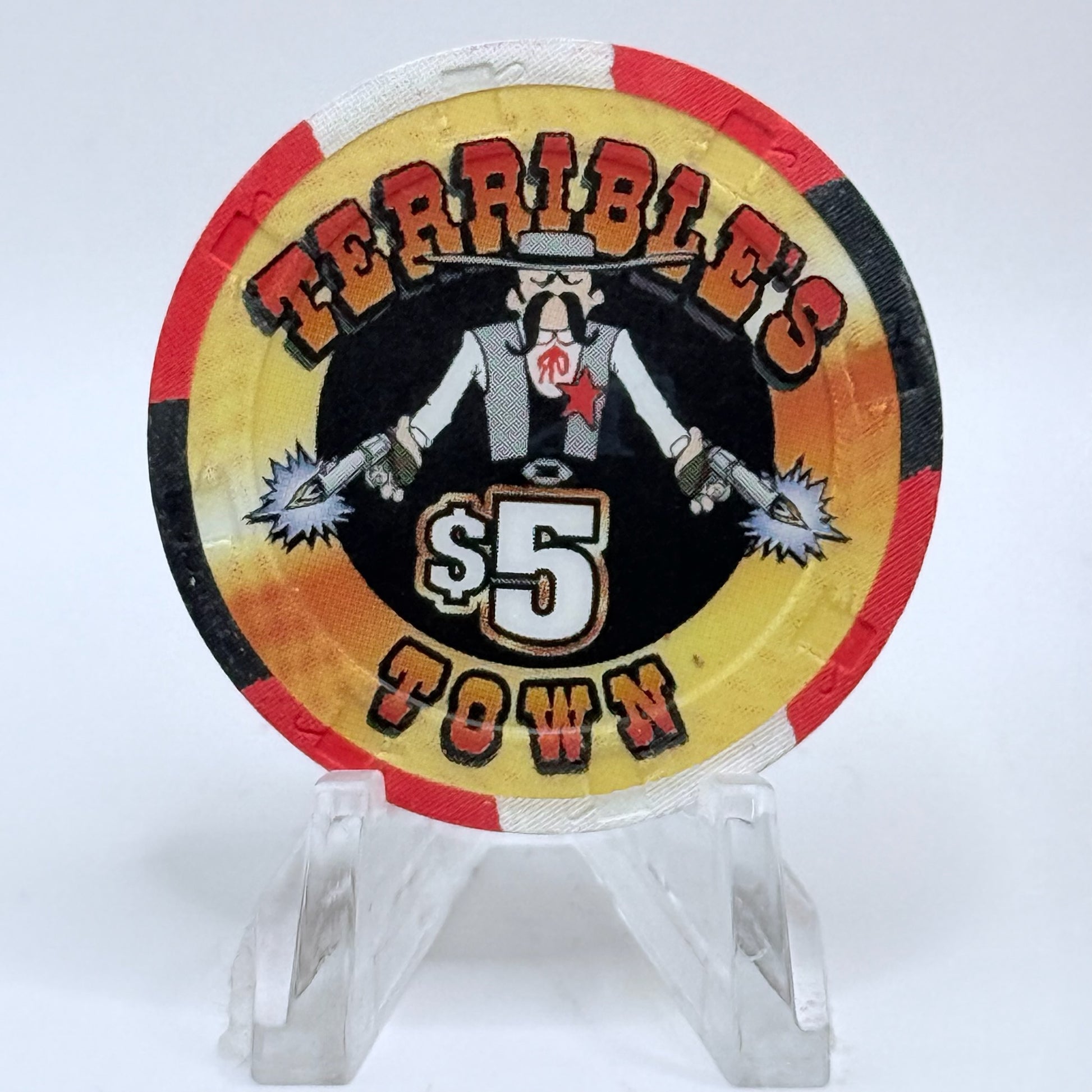 Capture a moment from the vibrant history of Pahrump with this 2000 $5 chip, once in play at Terrible's Town between 1996 and 2012.