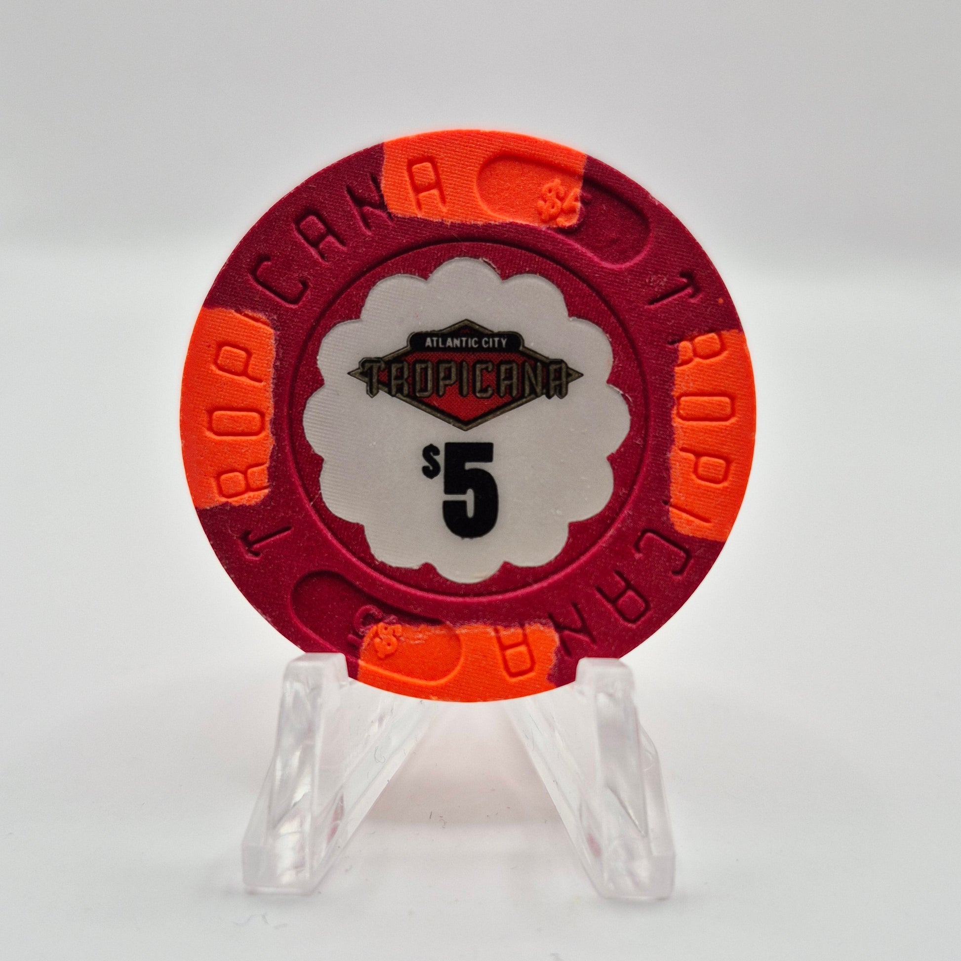 Discover the history of Tropicana Hotel Casino Atlantic City, open since 1981. Add to your collection this $5 casino chip, a unique piece from one of the most iconic casinos in New Jersey. Own a piece of gaming history with this authentic and valuable chip.