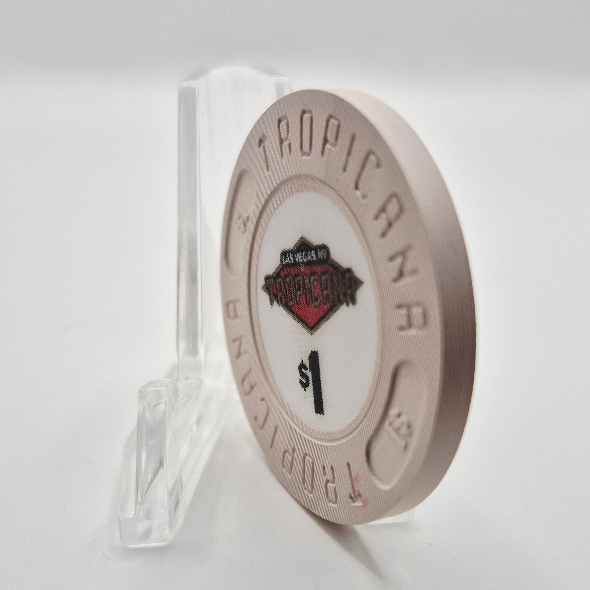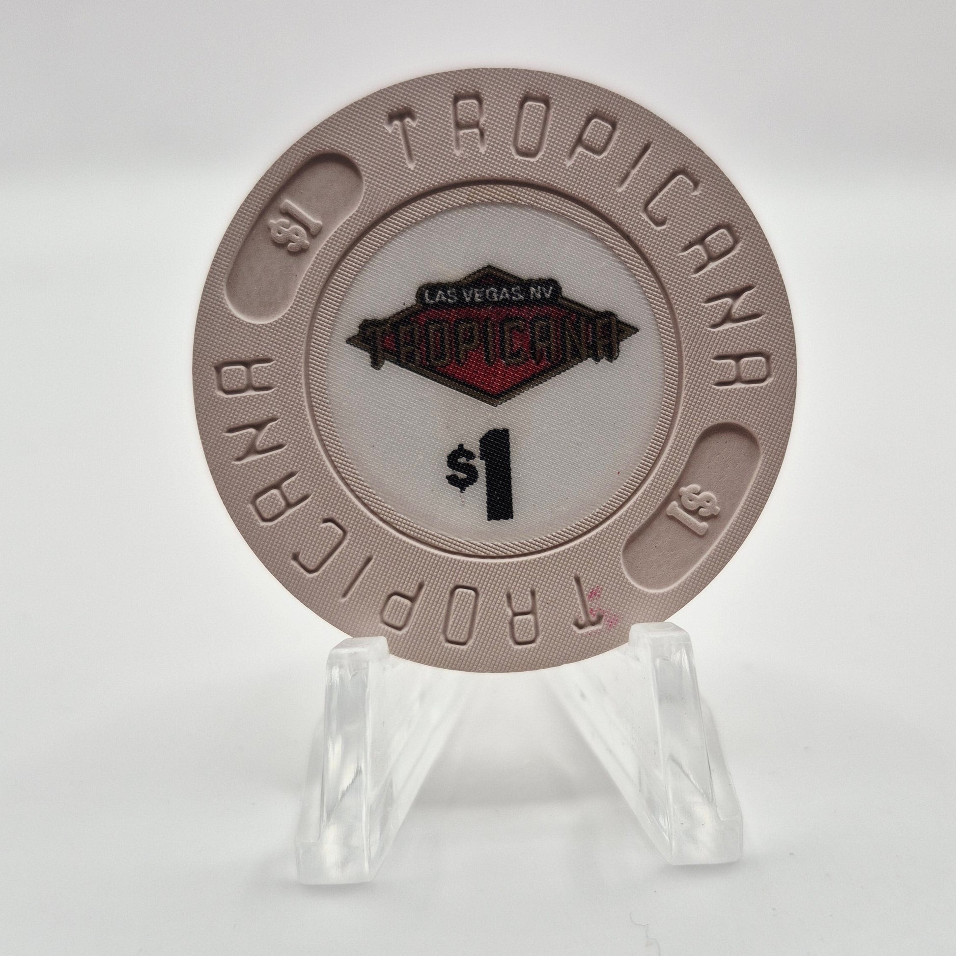 "The Tropicana Hotel Casino in Las Vegas, Nevada was a beloved establishment that opened in 1957 and unfortunately closed its doors in April of 2024. This limited edition $1 chip, featuring a linen texture, is a special piece of history for collectors and fans of the iconic casino."