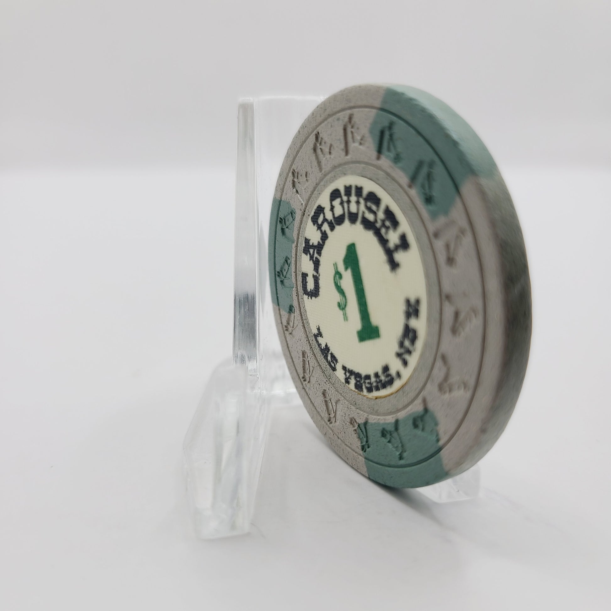 This vintage $1 chip from Carousel Casino in Las Vegas, Nevada was in circulation from 1968 to 1974. Own a piece of history from this iconic casino that operated for 9 years, adding to the allure of this collectible item.